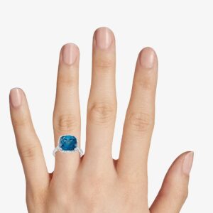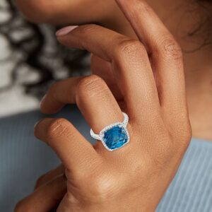 This stunning cocktail ring features a vibrant cushion-cut blue gemstone surrounded by a dazzling diamond halo and accented with round side diamonds, offering timeless elegance and brilliance.