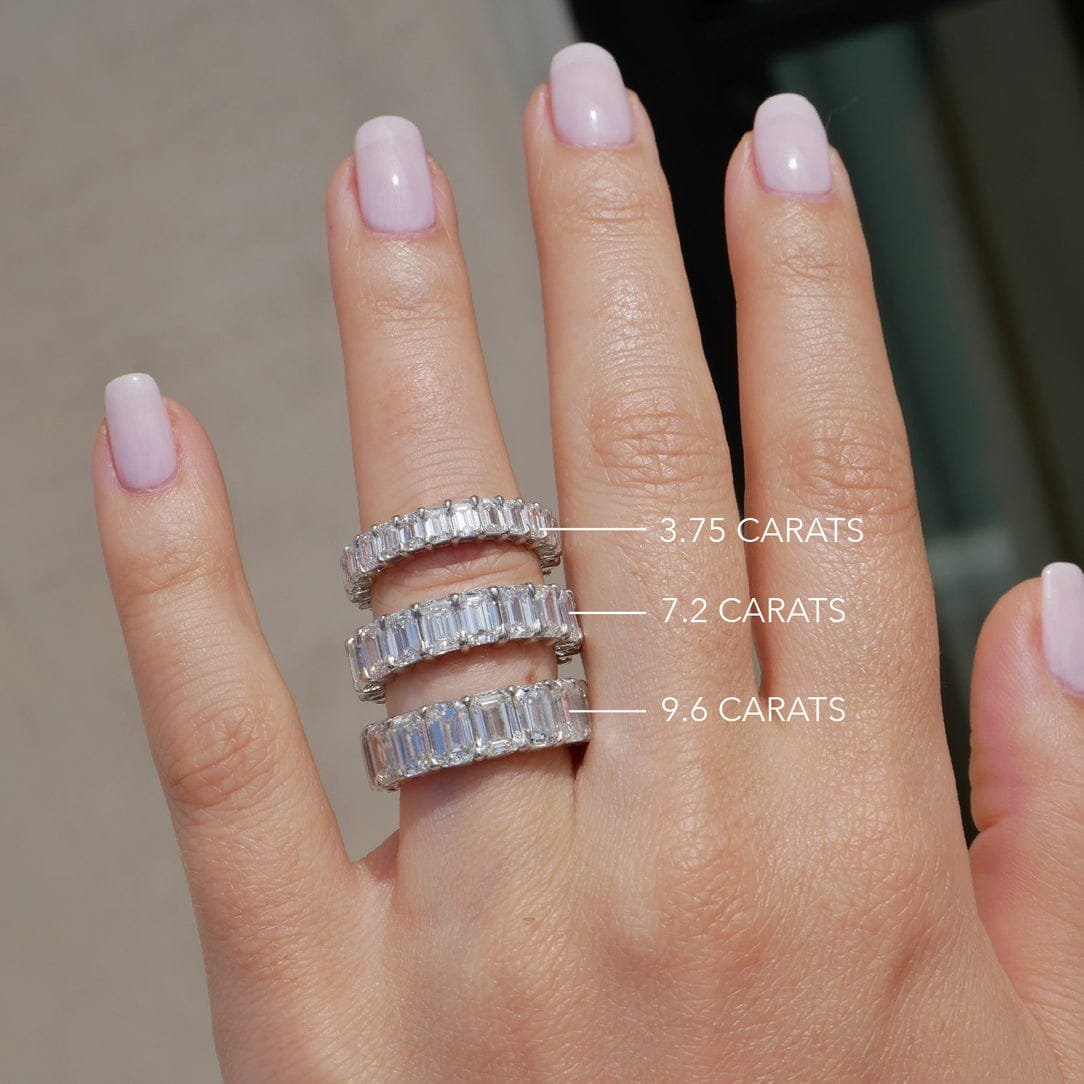 The Emerald Cut Diamond Eternity Band is one of our most popular wedding bands—and our founder, Emily, wears it daily. This handmade, minimal-metal setting can be stacked with your engagement ring or makes a statement worn on its own.
