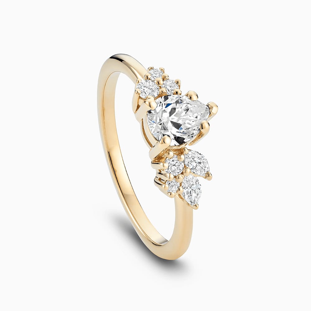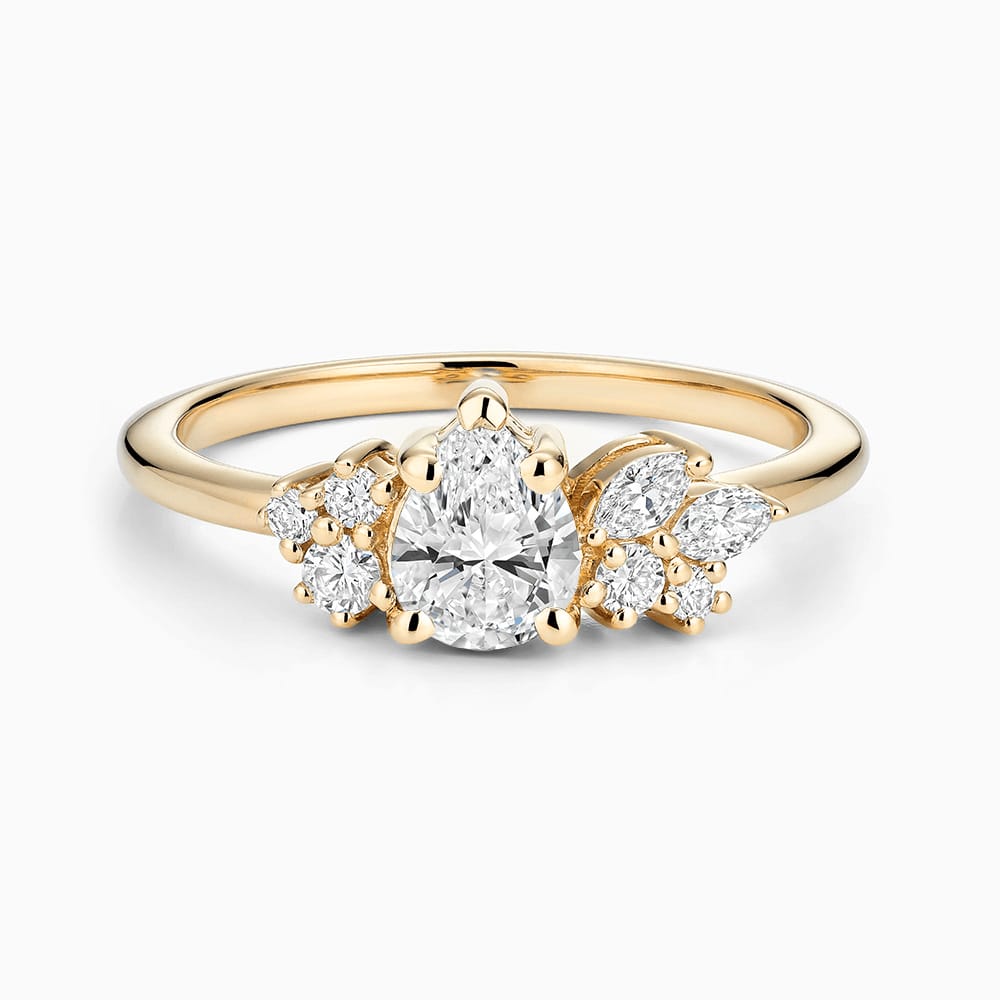 In an intricate display of expert craftsmanship, this Engagement Ring with Seven Side Diamonds revisits a classic style anew. Exuding the brilliance of an enchanting Center stone nestled between ethical round-cut diamonds, this diamond ring is one steeped in romance.