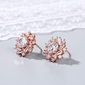 Our Round & Baguette Cut Diamond Stud Earrings, crafted in 14K Rose Gold, feature two 1.5 CT round white gemstones that capture and reflect light brilliantly. They are complemented by 16 baguette-cut and 16 small round-cut lab-grown diamonds, enhancing their brilliance and fire. These earrings are the epitome of elegance and sophistication, perfect for any occasion.